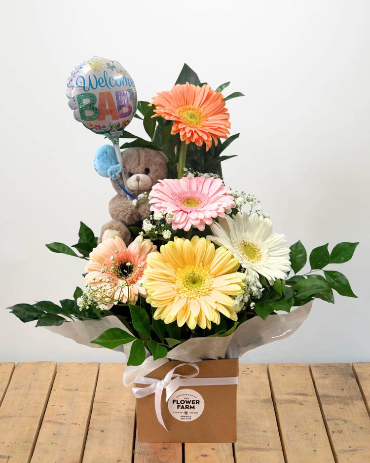 Blue Theme - Baby Boy Teddy & Balloon with a Neutral Floral Arrangement