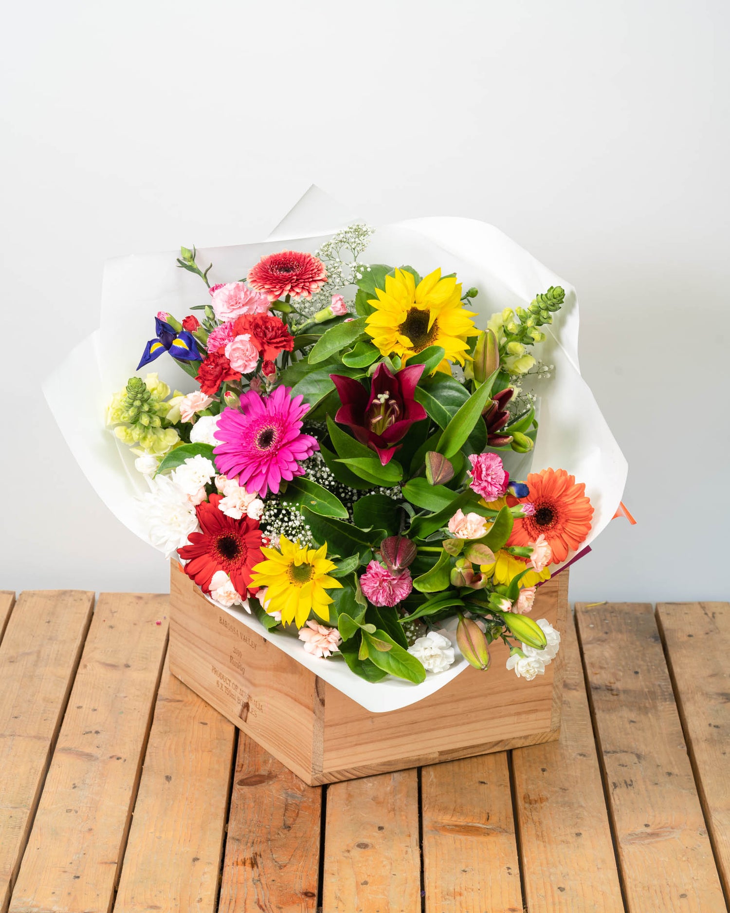 Our images are for illustrative purposes as Flowers & Colours will vary with daily fresh picks.  Photography prop Timber Box not included.