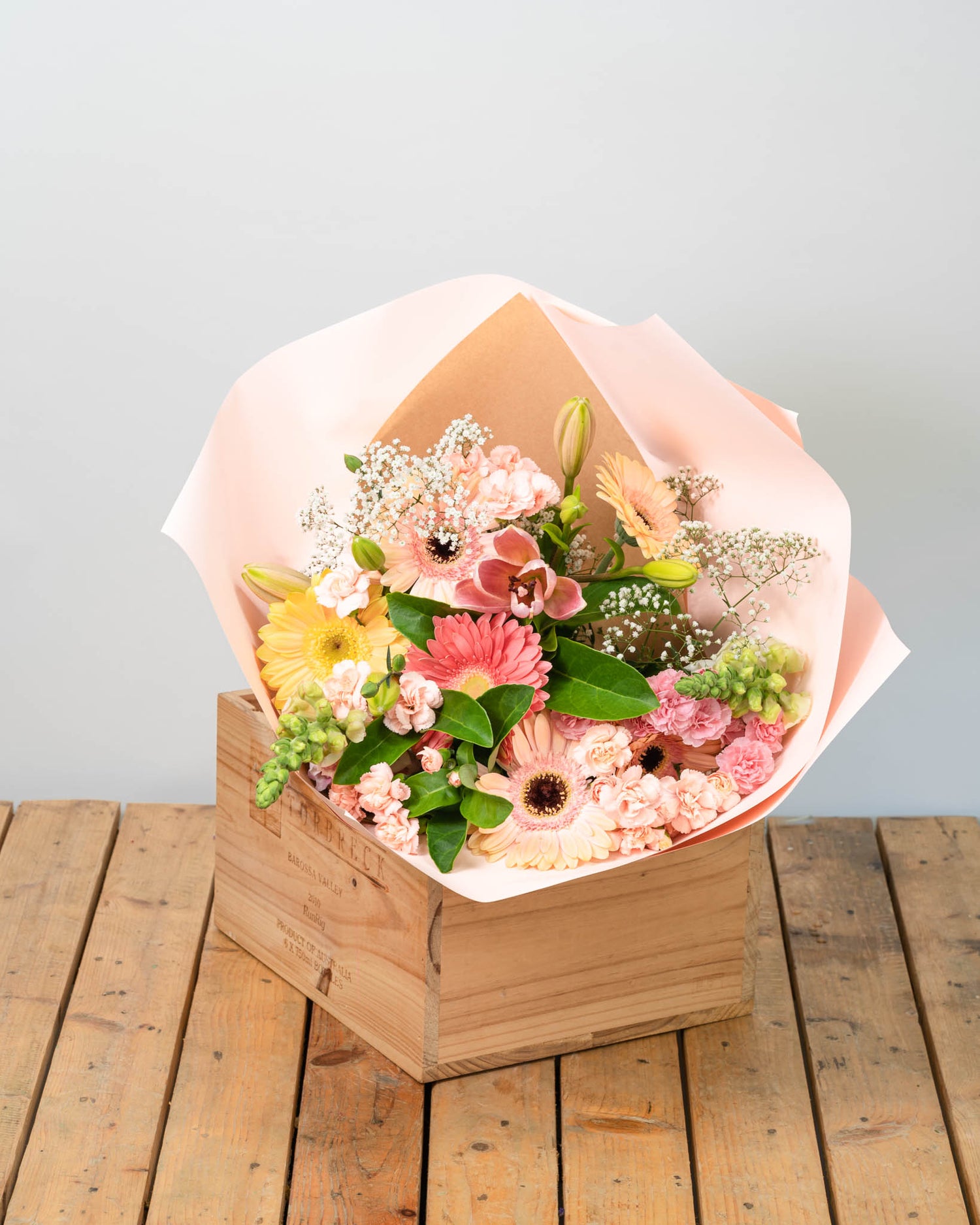 The flowers in your final arrangement may vary from the product image above but will be in the same style and colour scheme. Our experienced floral designers will create the arrangement using the freshest and most beautiful flowers available from our farm on the day. For more information, see our Terms & Conditions page.