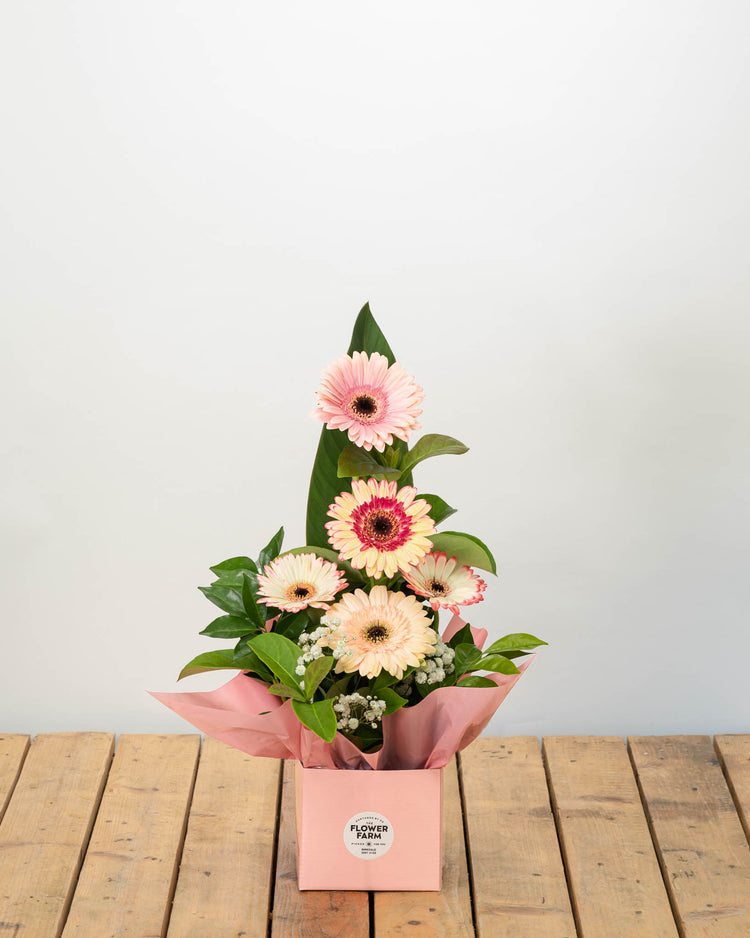 A gorgeous seasonal mix of farm fresh Gerberas, picked on the day and blooming with intensity. Available in a number of different hues and styles our Gerbera Arrangements are the perfect way to brighten someone's day.